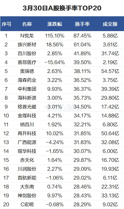 当天换手率最高的个股为N悦龙,全天换手率87.45%。族兴新材紧随其后,全天换手率61.04%。