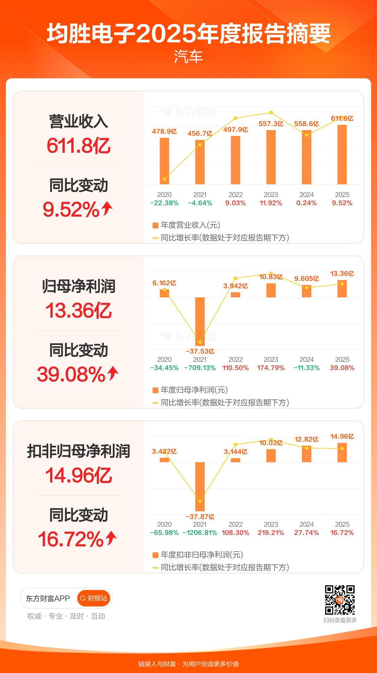 均胜电子3月31日发布2025年年报显示,公司全年实现营业收入611.83亿元,同比增长9.52%;归母净利润13.36亿元,同比增长39.08%;扣非归母净利润14.96亿元,同比增长16.72%。