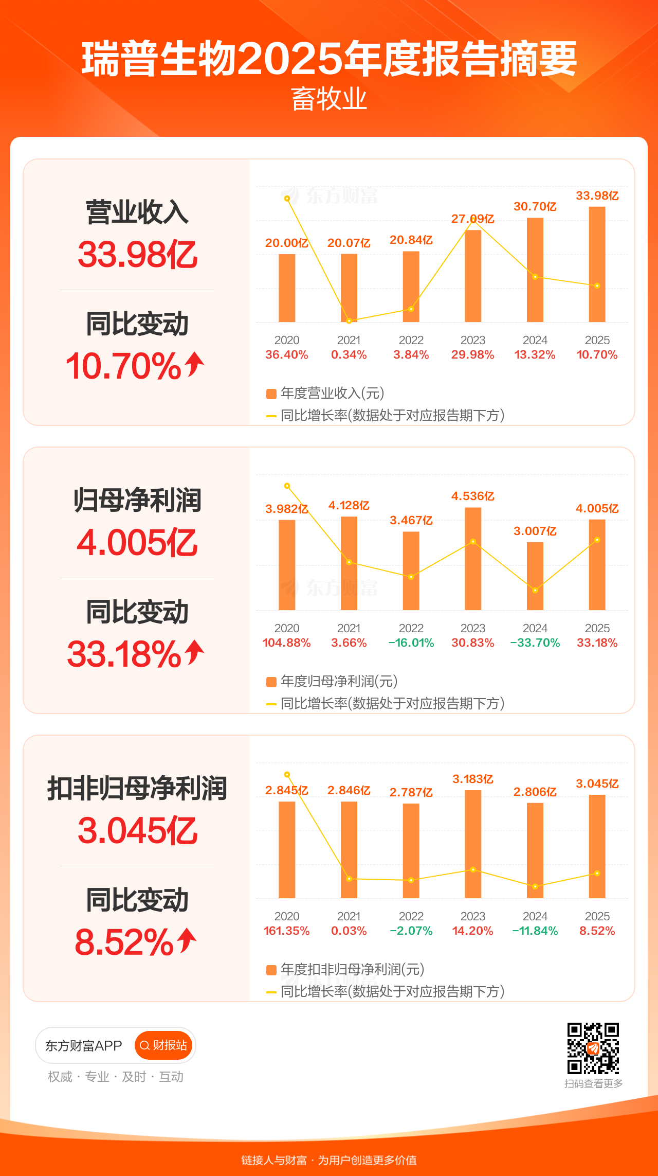 瑞普生物3月31日发布2025年年报显示,公司全年实现营业收入33.98亿元,同比增长10.70%;归母净利润4.01亿元,同比增长33.18%;扣非归母净利润3.05亿元,同比增长8.52%。
