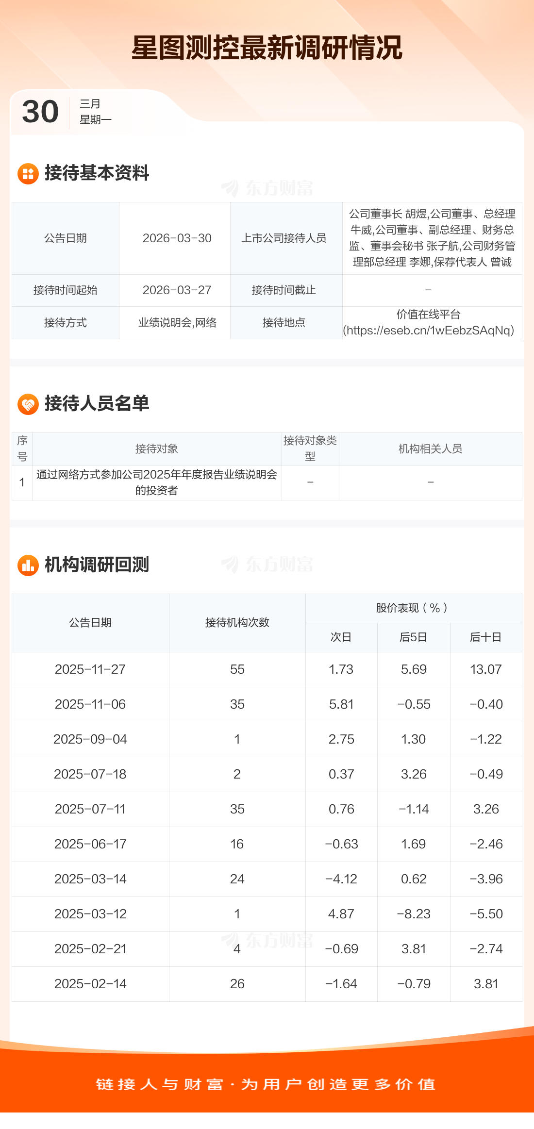 星图测控3月30日公告称,3月27日接待通过网络方式参加公司2025年年度报告业绩说明会的投资者等1家机构调研。接待人员包括公司董事长 胡煜,公司董事、总经理 牛威,公司董事、副总经理、财务总监、董事会秘书 张子航,公司财务管理部总经理 李娜,保荐代表人 曾诚。