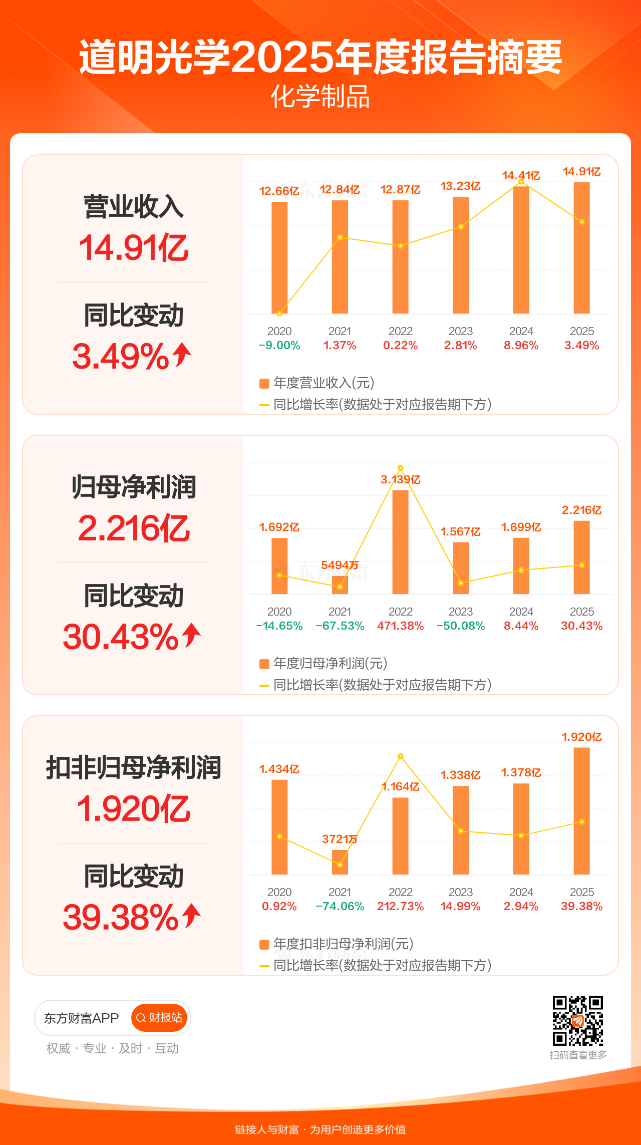 道明光学3月31日发布2025年年报显示,公司全年实现营业收入14.91亿元,同比增长3.49%;归母净利润2.22亿元,同比增长30.43%;扣非归母净利润1.92亿元,同比增长39.38%。