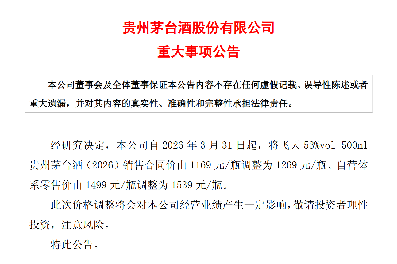 红星资本局3月30日消息,今日,贵州茅台(600519.SH)发布公告称,自3月31日起,飞天53%vol 500ml贵州茅台酒(2026)销售合同价由1169元/瓶调整为1269元/瓶,自营体系零售价由1499元/瓶调整为1539元/瓶。