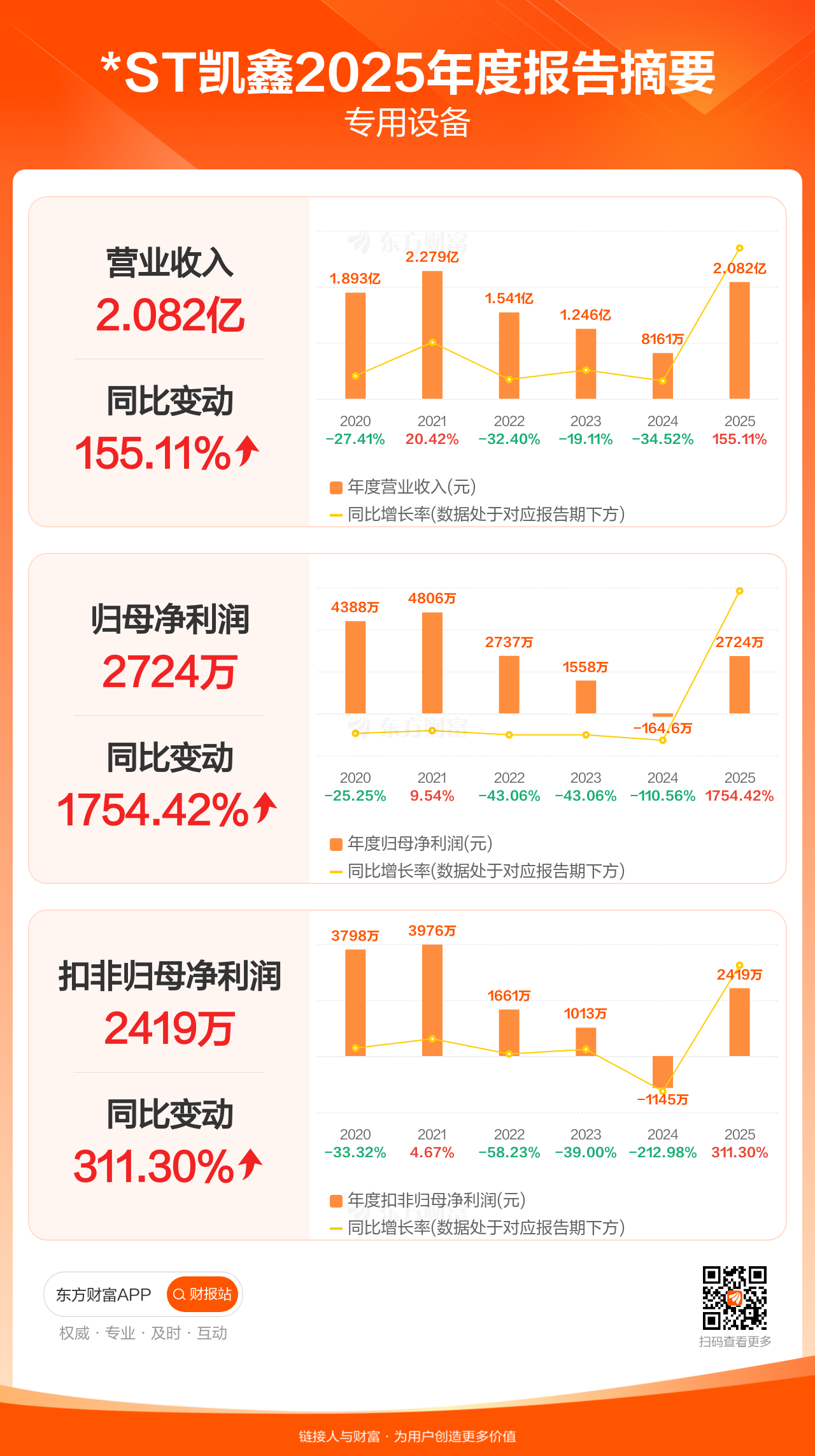 *ST凯鑫3月31日发布2025年年报显示,公司全年实现营业收入2.08亿元,同比增长155.11%;归母净利润2723.51万元,同比增长1754.42%;扣非归母净利润2418.62万元,同比增长311.30%。