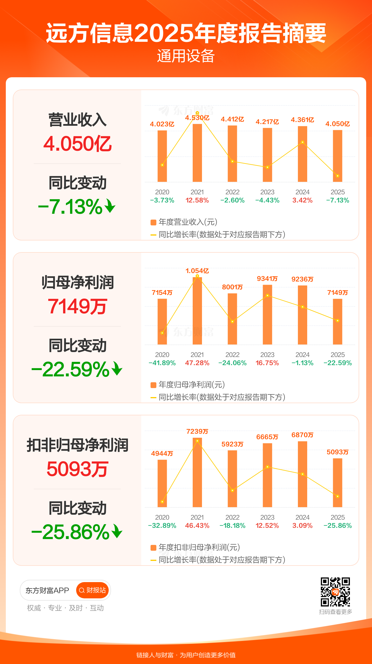 远方信息3月31日发布2025年年报显示,公司全年实现营业收入4.05亿元,同比下滑7.13%;归母净利润7149.09万元,同比下滑22.59%;扣非归母净利润5093.31万元,同比下滑25.86%。