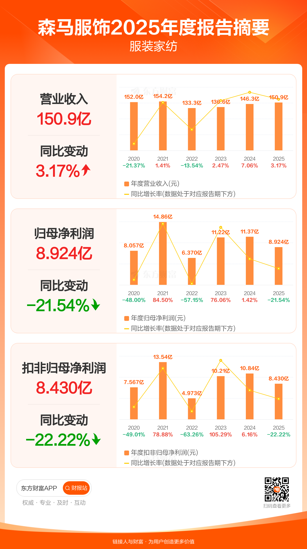 森马服饰3月31日发布2025年年报显示,公司全年实现营业收入150.90亿元,同比增长3.17%;归母净利润8.92亿元,同比下滑21.54%;扣非归母净利润8.43亿元,同比下滑22.22%。