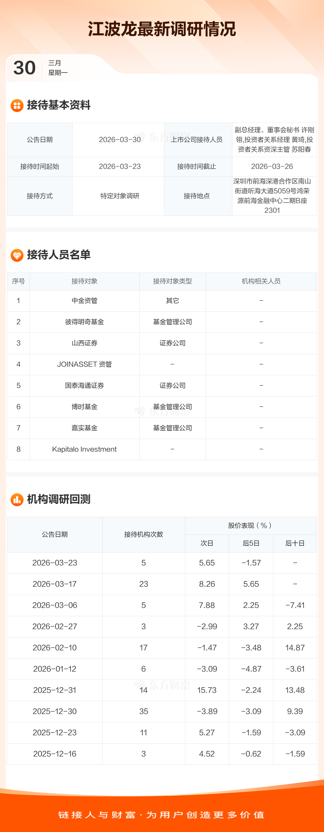 江波龙3月30日公告称,3月23日至3月26日接待中金资管等8家机构调研。接待人员包括副总经理、董事会秘书 许刚翎,投资者关系经理 黄琦,投资者关系资深主管 苏阳春。