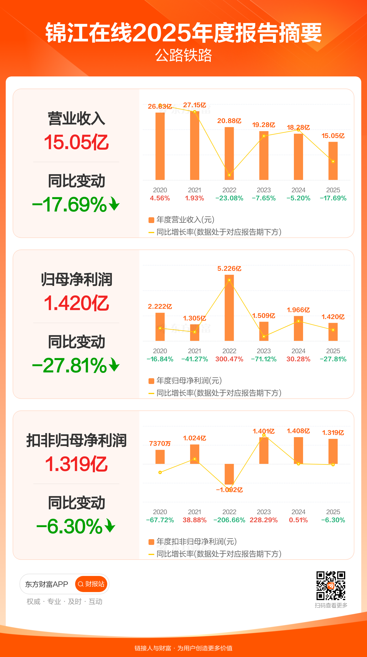 锦江在线3月31日发布2025年年报显示,公司全年实现营业收入15.05亿元,同比下滑17.69%;归母净利润1.42亿元,同比下滑27.81%;扣非归母净利润1.32亿元,同比下滑6.30%。