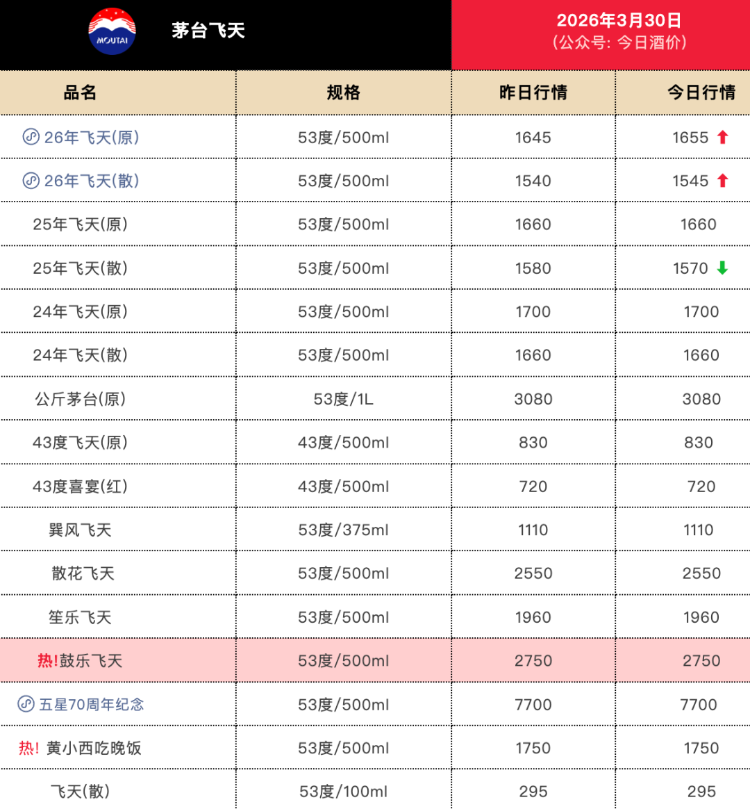 今日酒价数据显示,3月30日,53度/500ml26年飞天(原)批发参考价报1655元/瓶,53度/500ml26年飞天(散)批发参考价报1545元/瓶,分别较昨日增长10元、5元。