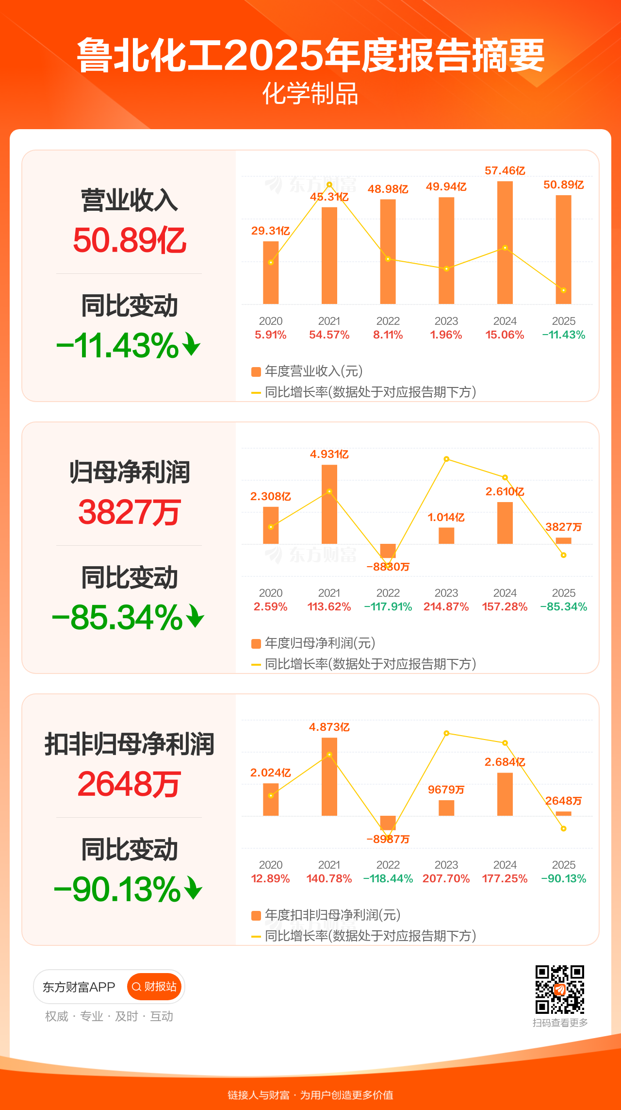 鲁北化工3月31日发布2025年年报显示,公司全年实现营业收入50.89亿元,同比下滑11.43%;归母净利润3827.12万元,同比下滑85.34%;扣非归母净利润2647.63万元,同比下滑90.13%。