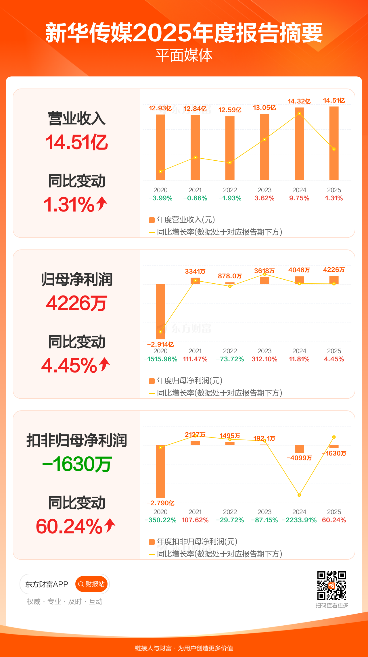 新华传媒3月31日发布2025年年报显示,公司全年实现营业收入14.51亿元,同比增长1.31%;归母净利润4225.78万元,同比增长4.45%;扣非归母净利润-1629.75万元。