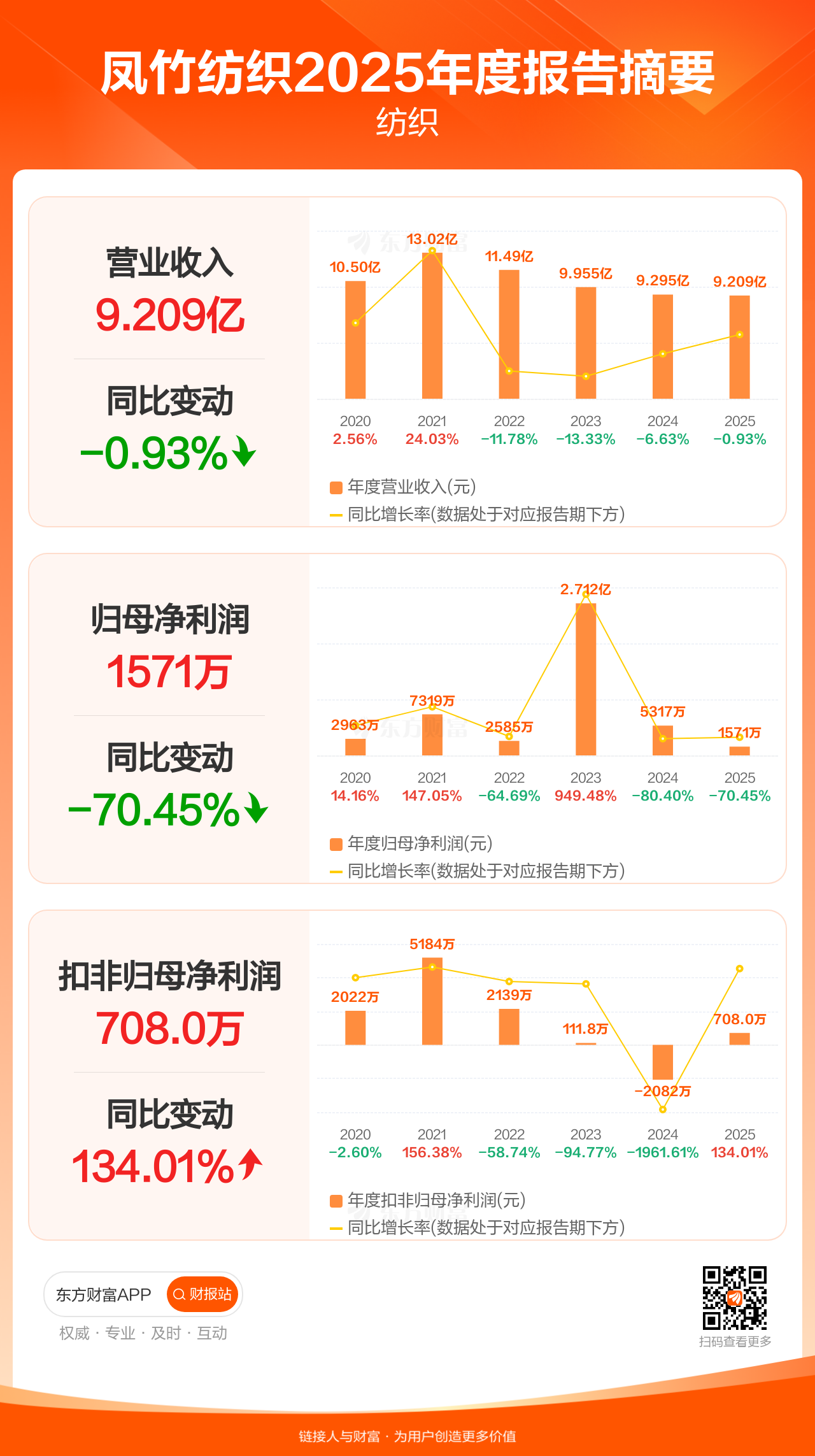 凤竹纺织3月31日发布2025年年报显示,公司全年实现营业收入9.21亿元,同比下滑0.93%;归母净利润1571.03万元,同比下滑70.45%;扣非归母净利润708.04万元,同比增长134.01%。