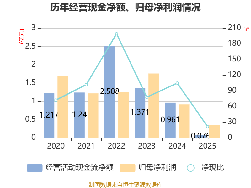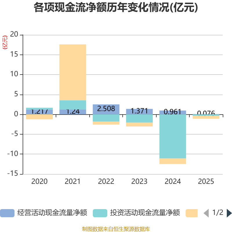 截至2025年,公司经营活动现金流净额为755.08万元,同比下降92.14%;筹资活动现金流净额-7340.26万元,同比增加6646.88万元;投资活动现金流净额-3728.8万元,上年同期为-11.09亿元。