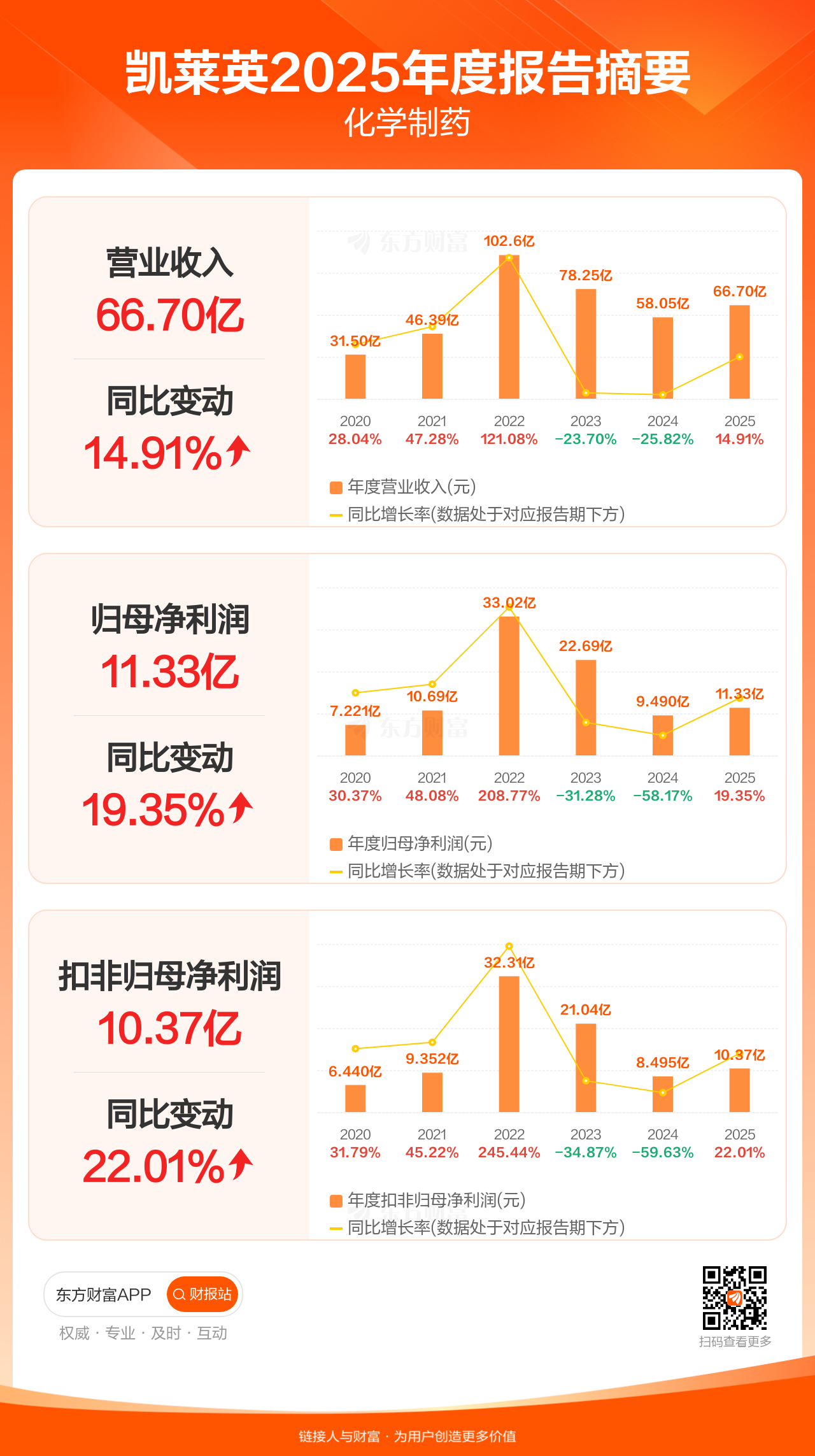 凯莱英3月31日发布2025年年报显示,公司全年实现营业收入66.70亿元,同比增长14.91%;归母净利润11.33亿元,同比增长19.35%;扣非归母净利润10.37亿元,同比增长22.01%。