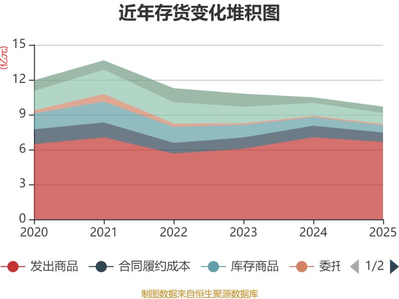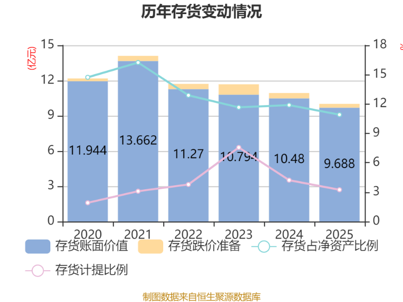 从存货变动来看,截至2025年末,公司存货账面价值为9.69亿元,占净资产的10.91%,较上年末减少7923.39万元。其中,存货跌价准备为3248.56万元,计提比例为3.24%。