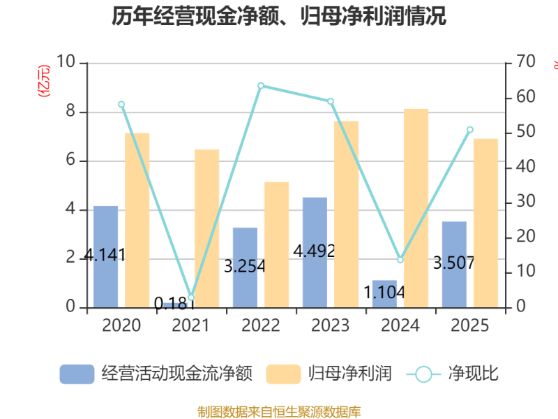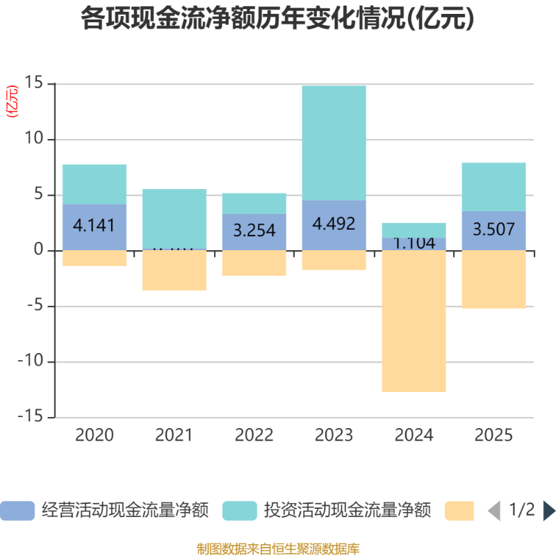 截至2025年,公司经营活动现金流净额为3.51亿元,同比增长217.73%;筹资活动现金流净额-5.24亿元,同比增加7.51亿元;投资活动现金流净额4.36亿元,上年同期为1.35亿元。