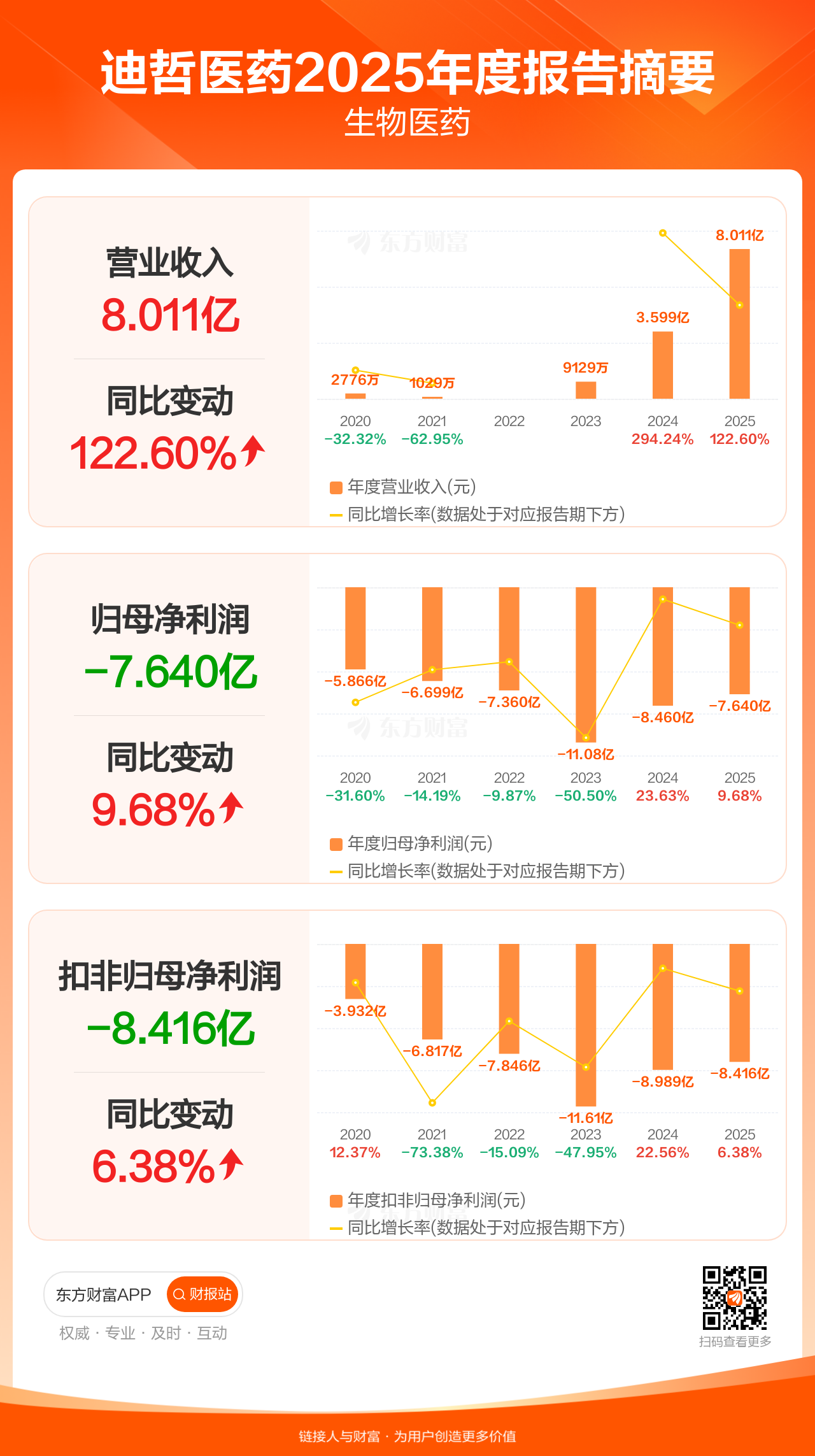迪哲医药3月31日发布2025年年报显示,公司全年实现营业收入8.01亿元,同比增长122.60%;归母净利润-7.64亿元;扣非归母净利润-8.42亿元。