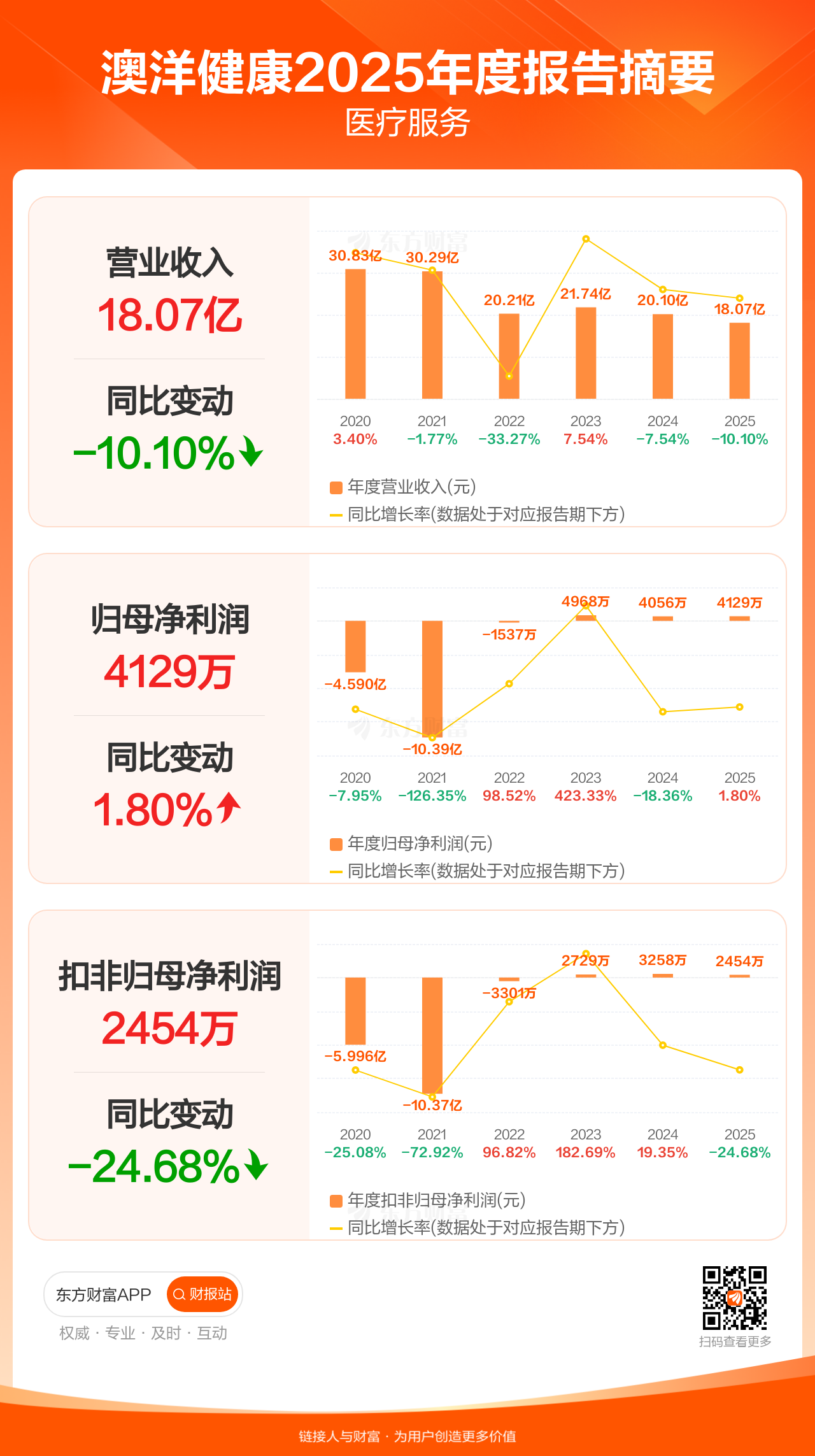 澳洋健康3月31日发布2025年年报显示,公司全年实现营业收入18.07亿元,同比下滑10.10%;归母净利润4129.13万元,同比增长1.80%;扣非归母净利润2453.68万元,同比下滑24.68%。