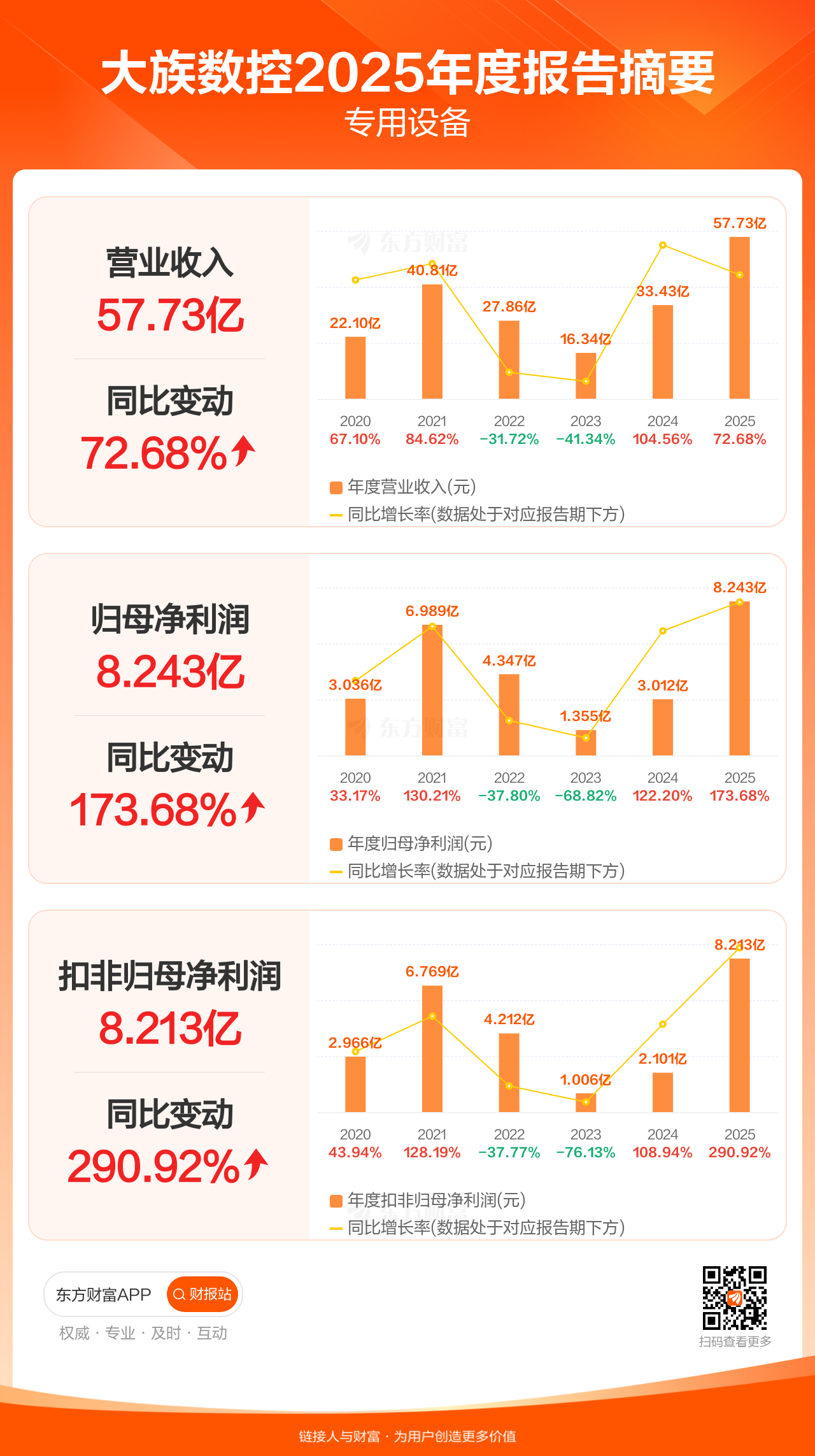 大族数控3月31日发布2025年年报显示,公司全年实现营业收入57.73亿元,同比增长72.68%;归母净利润8.24亿元,同比增长173.68%;扣非归母净利润8.21亿元,同比增长290.92%。