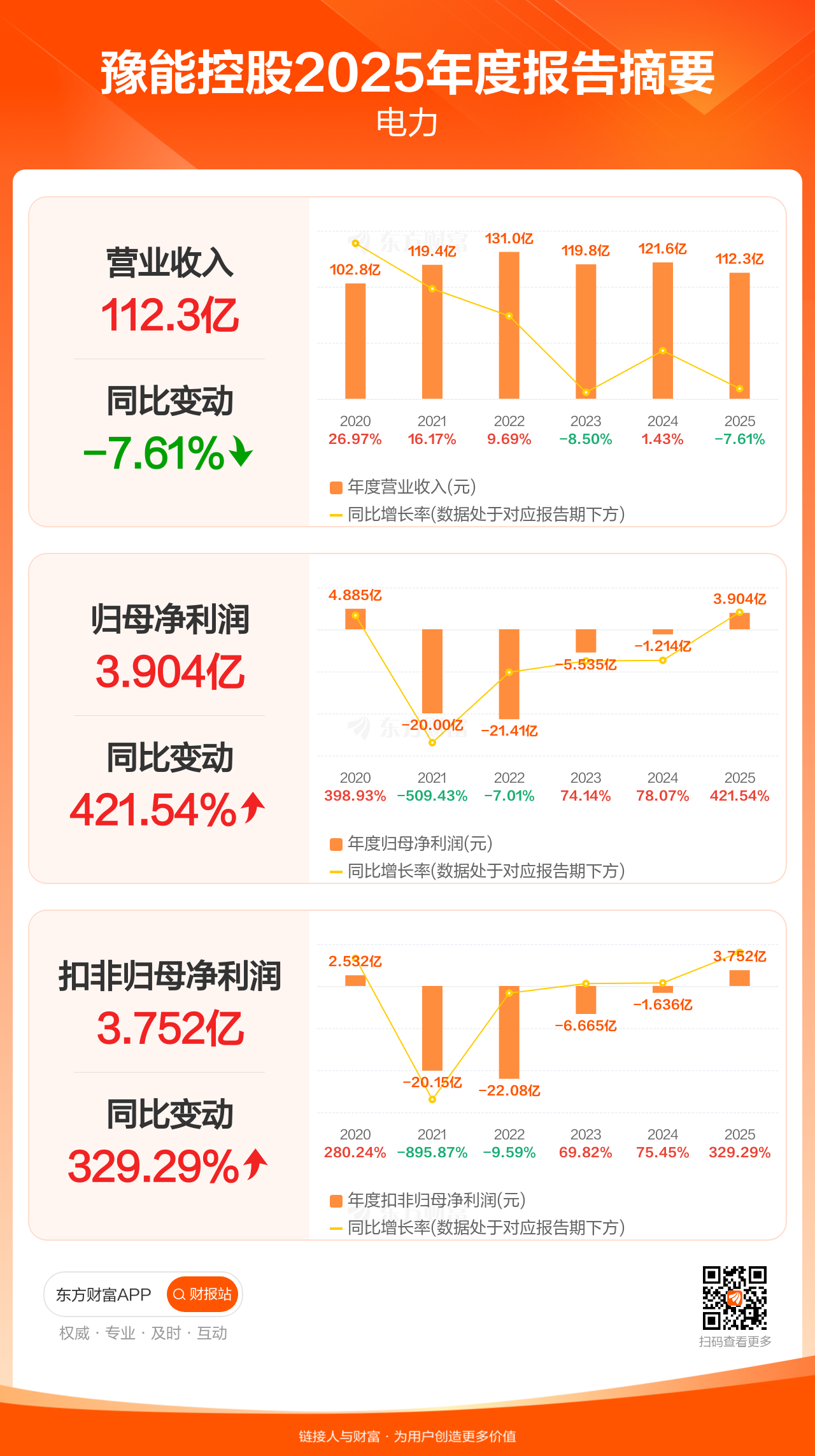 豫能控股3月31日发布2025年年报显示,公司全年实现营业收入112.30亿元,同比下滑7.61%;归母净利润3.90亿元,同比增长421.54%;扣非归母净利润3.75亿元,同比增长329.29%。