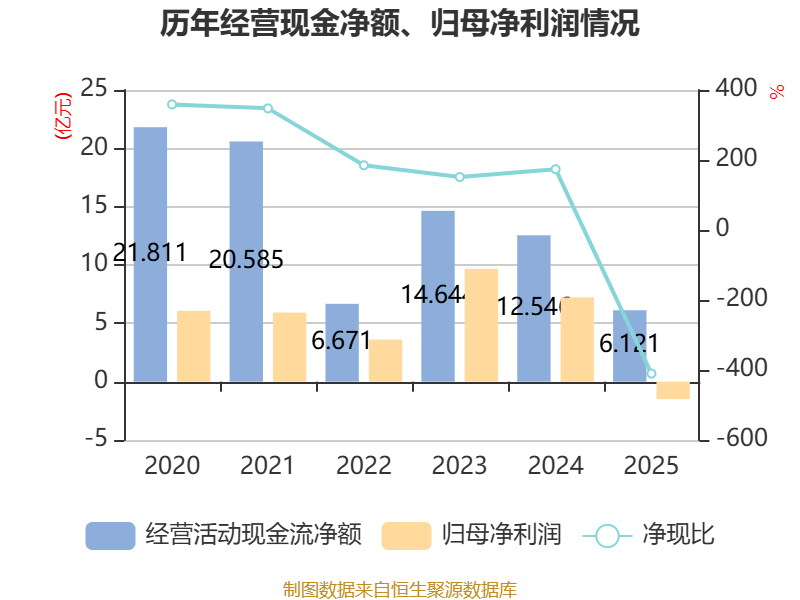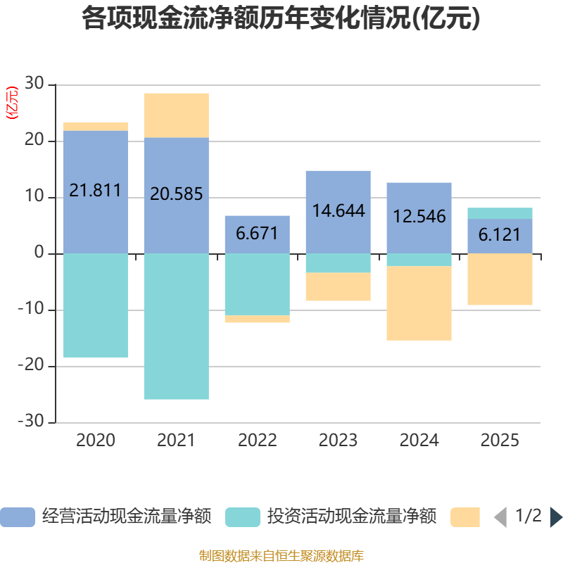 截至2025年,公司经营活动现金流净额为6.12亿元,同比下降51.21%;筹资活动现金流净额-9.16亿元,同比增加4.03亿元;投资活动现金流净额1.98亿元,上年同期为-2.29亿元。