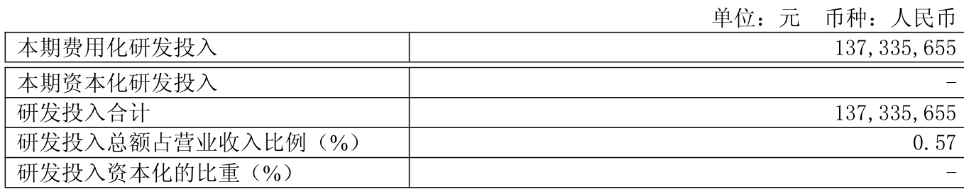 2025年全年,公司研发投入金额为1.37亿元,同比增长0.21%;研发投入占营业收入比例为0.57%,相比上年同期上升0.01个百分点。此外,公司全年研发投入资本化率为0%。