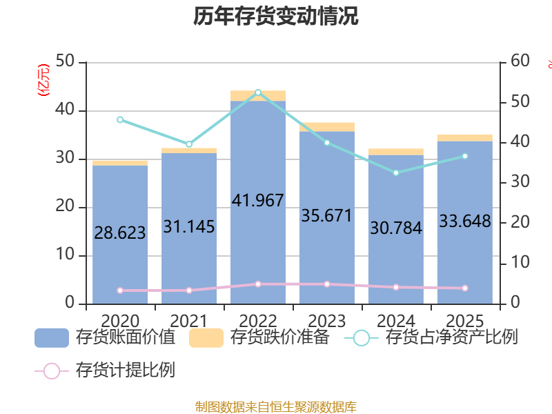 从存货变动来看,截至2025年末,公司存货账面价值为33.65亿元,占净资产的36.64%,较上年末增加2.86亿元。其中,存货跌价准备为1.34亿元,计提比例为3.84%。