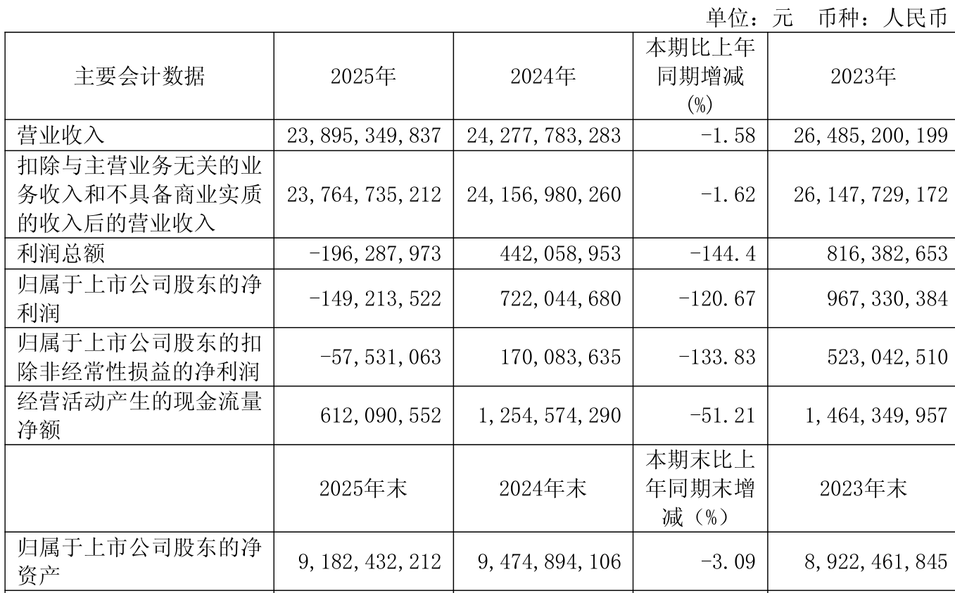 中证智能财讯光明乳业(600597)3月31日披露2025年年度报告。2025年,公司实现营业总收入238.95亿元,同比下降1.58%;归母净利润亏损1.49亿元,上年同期盈利7.22亿元;扣非净利润亏损5753.11万元,上年同期盈利1.7亿元;经营活动产生的现金流量净额为6.12亿元,同比下降51.21%;报告期内,光明乳业基本每股收益为-0.11元,加权平均净资产收益率为-1.60%。