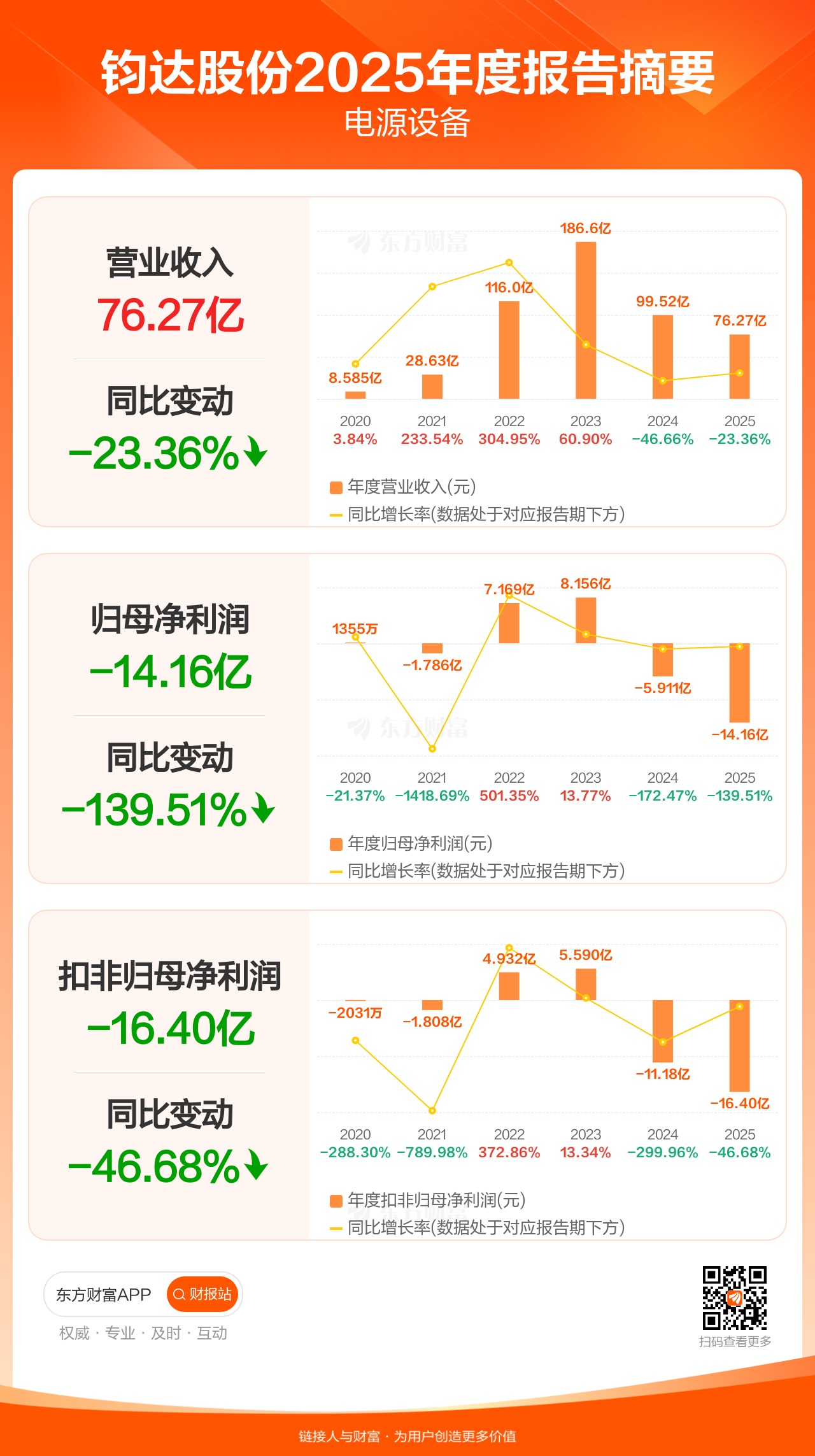 钧达股份3月31日发布2025年年报显示,公司全年实现营业收入76.27亿元,同比下滑23.36%;归母净利润-14.16亿元;扣非归母净利润-16.40亿元。每股EPS-5.35元,低于机构一致预测的2.00元。