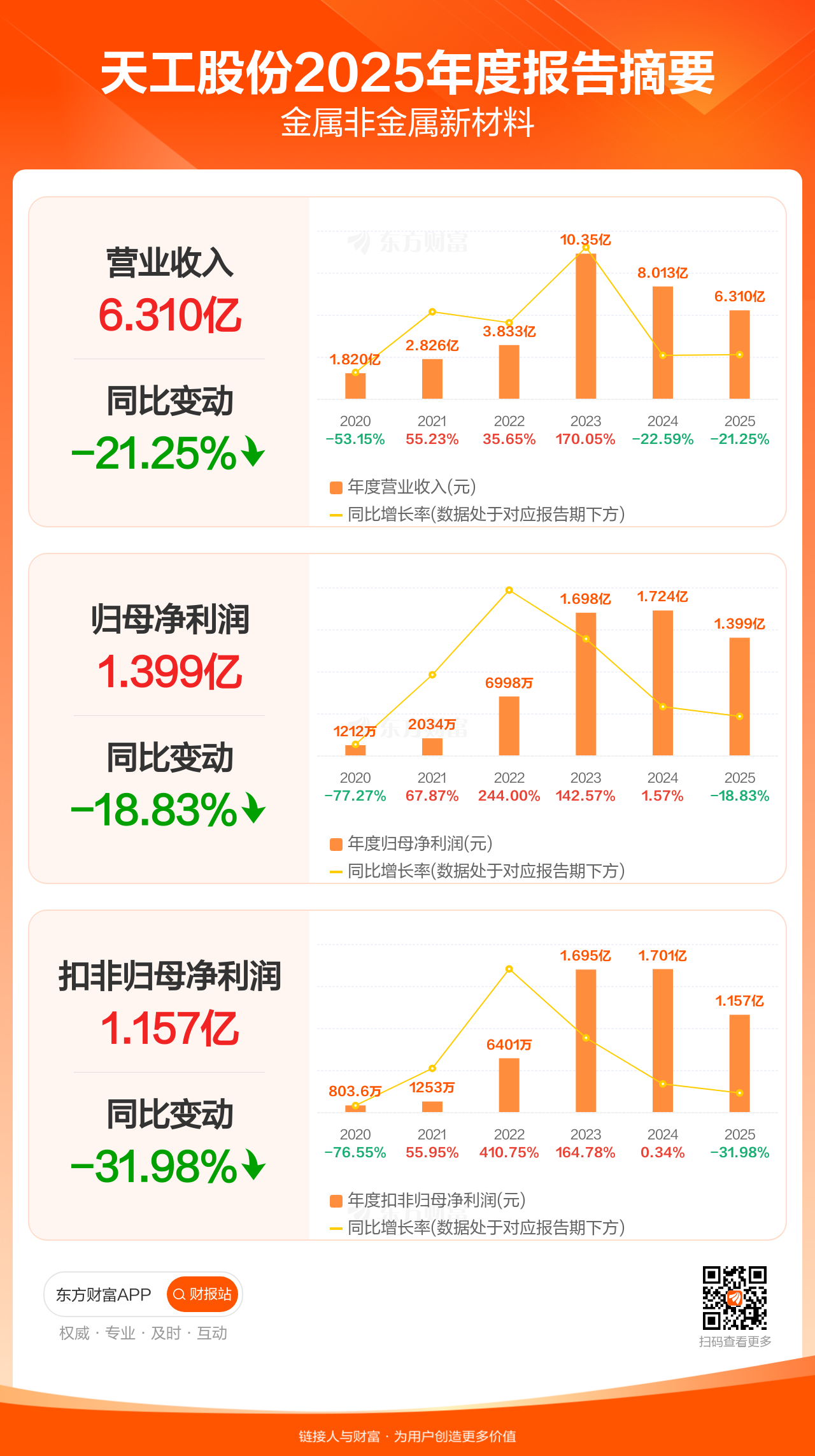 天工股份3月30日发布2025年年报显示,公司全年实现营业收入6.31亿元,同比下滑21.25%;归母净利润1.40亿元,同比下滑18.83%;扣非归母净利润1.16亿元,同比下滑31.98%。每股EPS0.22元,低于机构一致预测的0.31元。
