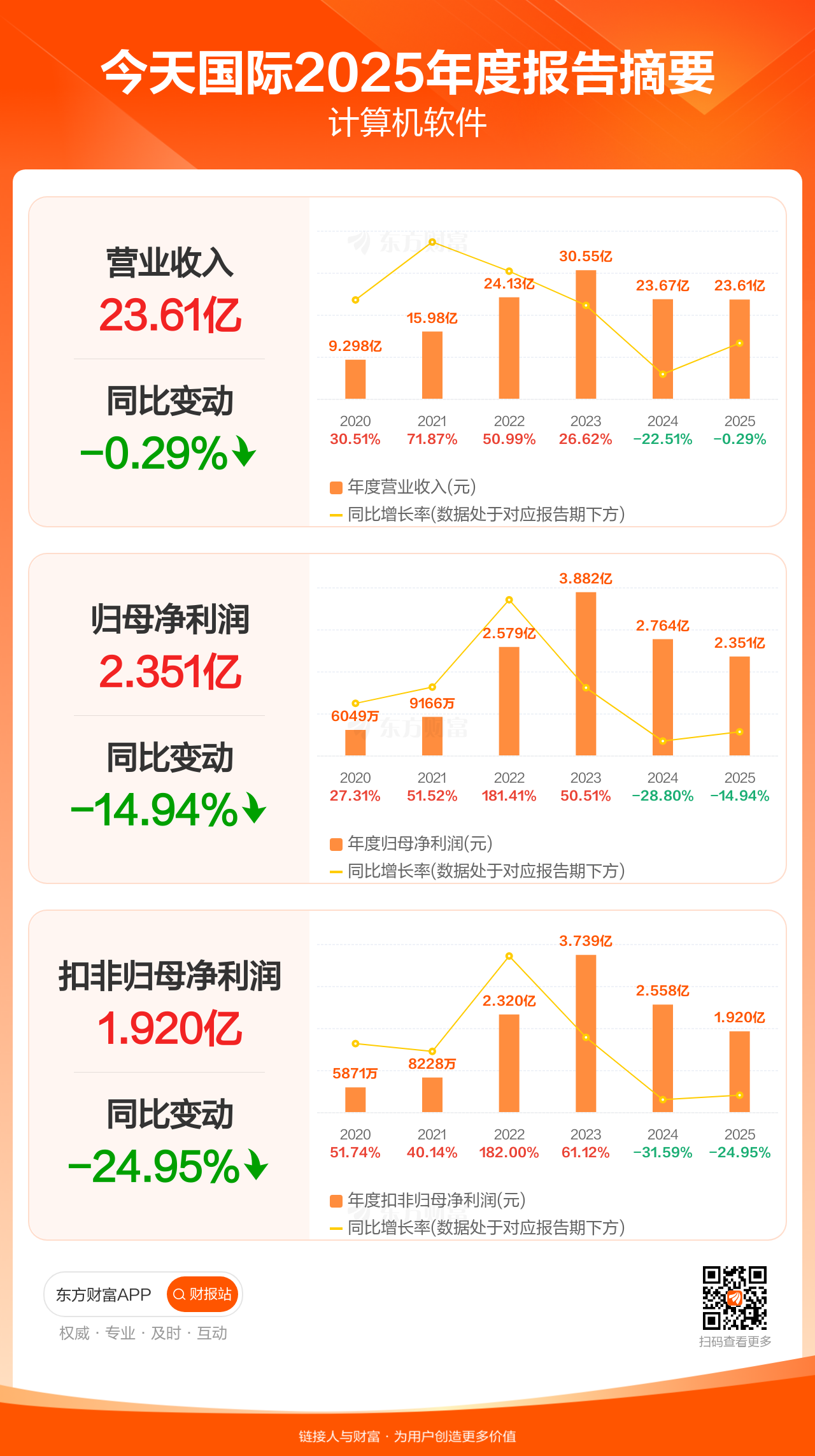 今天国际3月31日发布2025年年报显示,公司全年实现营业收入23.61亿元,同比下滑0.29%;归母净利润2.35亿元,同比下滑14.94%;扣非归母净利润1.92亿元,同比下滑24.95%。每股EPS0.52元,低于机构一致预测的0.72元。