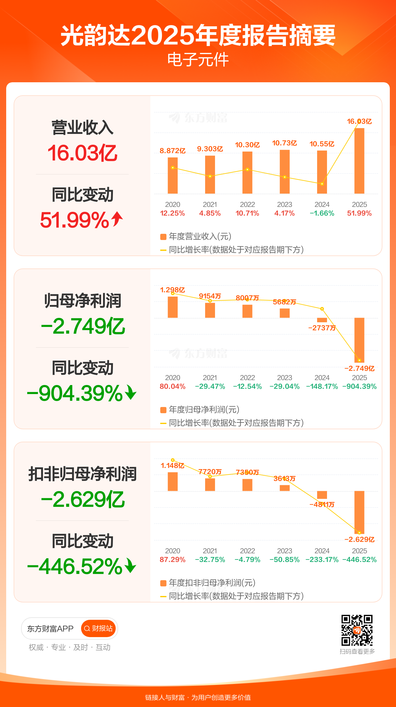 光韵达3月31日发布2025年年报显示,公司全年实现营业收入16.03亿元,同比增长51.99%;归母净利润-2.75亿元;扣非归母净利润-2.63亿元。