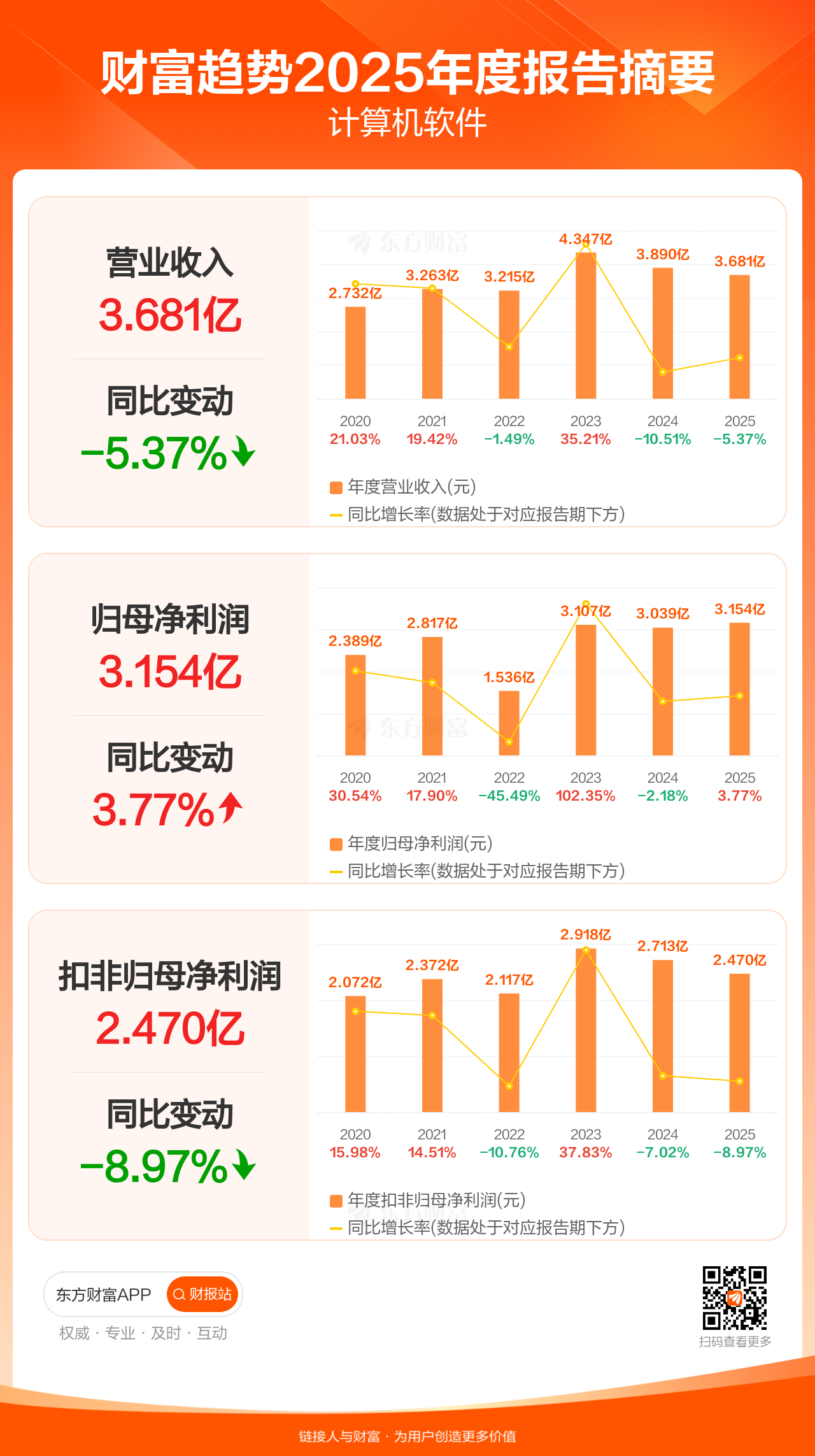 财富趋势3月31日发布2025年年报显示,公司全年实现营业收入3.68亿元,同比下滑5.37%;归母净利润3.15亿元,同比增长3.77%;扣非归母净利润2.47亿元,同比下滑8.97%。