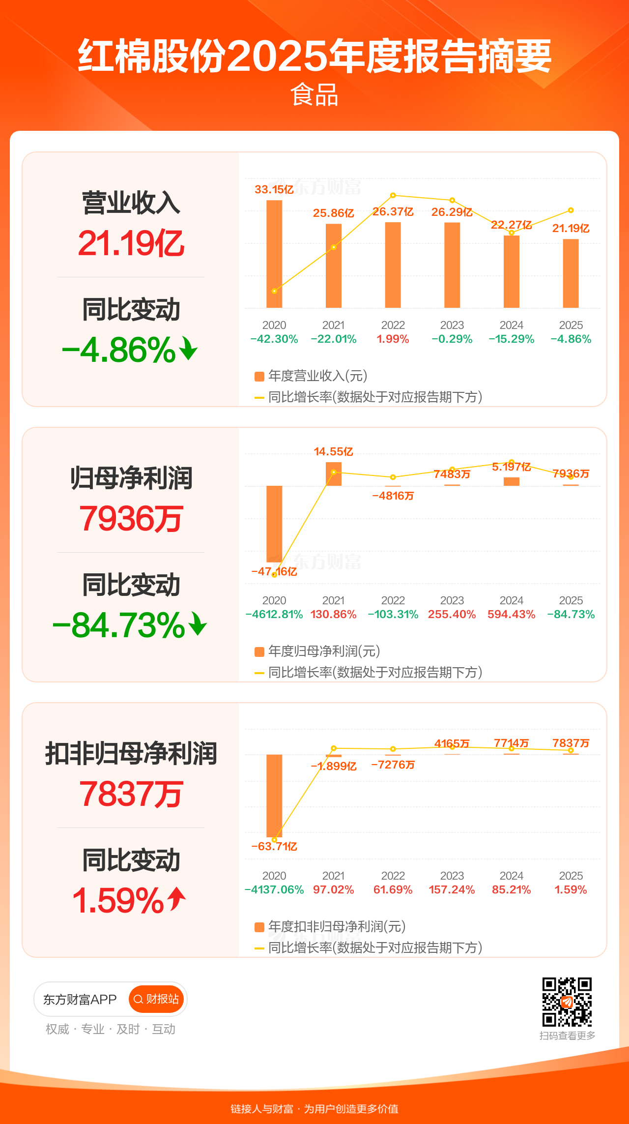 红棉股份3月31日发布2025年年报显示,公司全年实现营业收入21.19亿元,同比下滑4.86%;归母净利润7936.16万元,同比下滑84.73%;扣非归母净利润7836.66万元,同比增长1.59%。