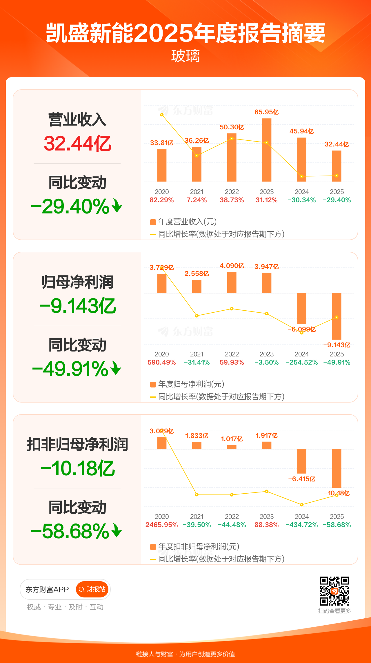 凯盛新能3月31日发布2025年年报显示,公司全年实现营业收入32.44亿元,同比下滑29.40%;归母净利润-9.14亿元;扣非归母净利润-10.18亿元。每股EPS-1.42元,低于机构一致预测的0.21元。
