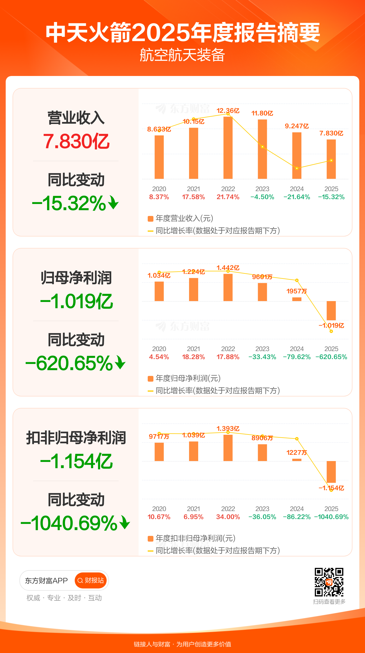 中天火箭3月31日发布2025年年报显示,公司全年实现营业收入7.83亿元,同比下滑15.32%;归母净利润-1.02亿元;扣非归母净利润-1.15亿元。每股EPS-0.66元,低于机构一致预测的0.42元。