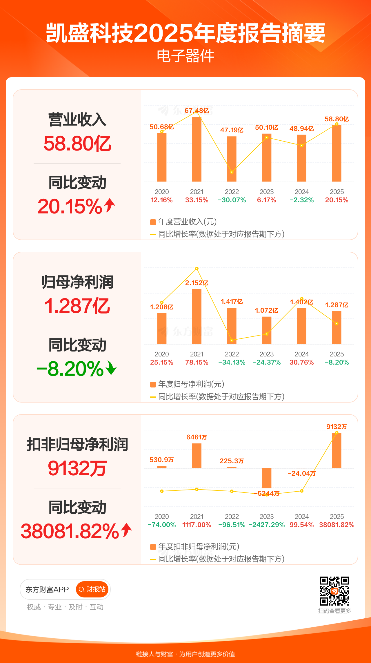 凯盛科技3月31日发布2025年年报显示,公司全年实现营业收入58.80亿元,同比增长20.15%;归母净利润1.29亿元,同比下滑8.20%;扣非归母净利润9131.85万元,同比增长38081.82%。