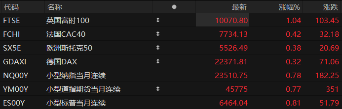周一盘前,美股三大股指期货齐涨,欧洲主要指数普遍上涨。截至发稿,纳斯达克100指数期货涨0.78%,道指期货涨0.77%,标普500指数期货涨0.81%。