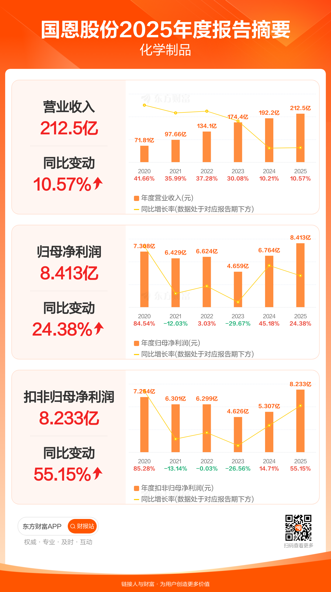 国恩股份3月31日发布2025年年报显示,公司全年实现营业收入212.51亿元,同比增长10.57%;归母净利润8.41亿元,同比增长24.38%;扣非归母净利润8.23亿元,同比增长55.15%。