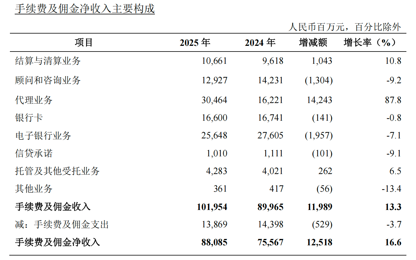 非息收入方面,2025 年,农行实现手续费及佣金净收入880.85亿元,较上年增长16.6%。其中代理业务增长87.8%,主要是由于该行深入推进财富管理业务转型,理财和代销基金收入增加。