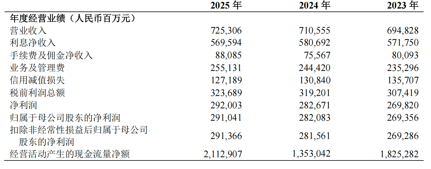 财报显示,2025 年,该行实现利息净收入5695.94亿元,较上年下降110.98亿元,其中,规模增长导致利息净收入增加440.49亿元,利率变动导致利息净收入减少551.47亿元。