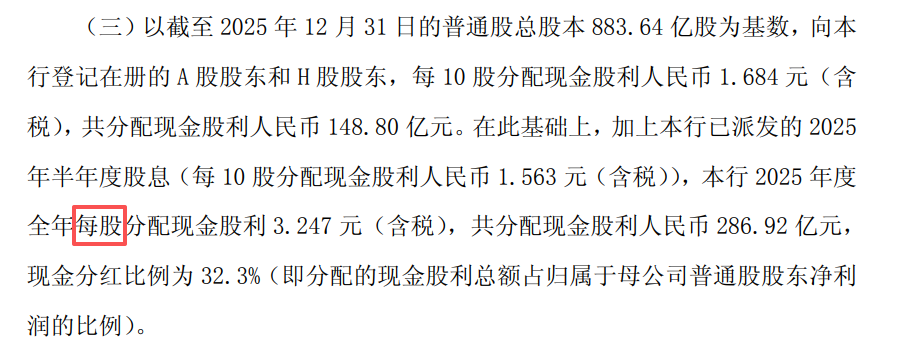具体而言,更正前,交通银行2025年度全年每股分配现金股利3.247元(含税);更正后的方案为2025年度全年每10股分配现金股利3.247元(含税)。