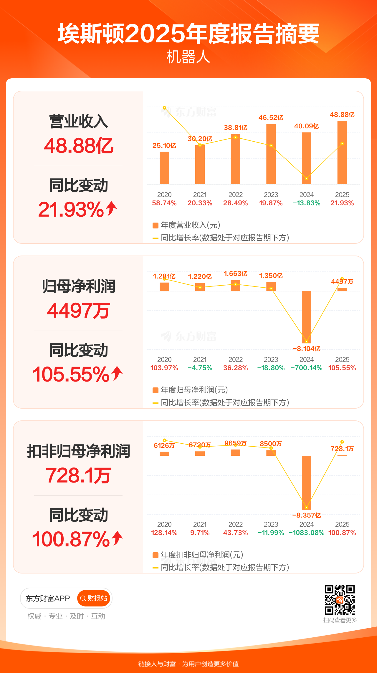 埃斯顿3月31日发布2025年年报显示,公司全年实现营业收入48.88亿元,同比增长21.93%;归母净利润4497.22万元,同比增长105.55%;扣非归母净利润728.06万元,同比增长100.87%。
