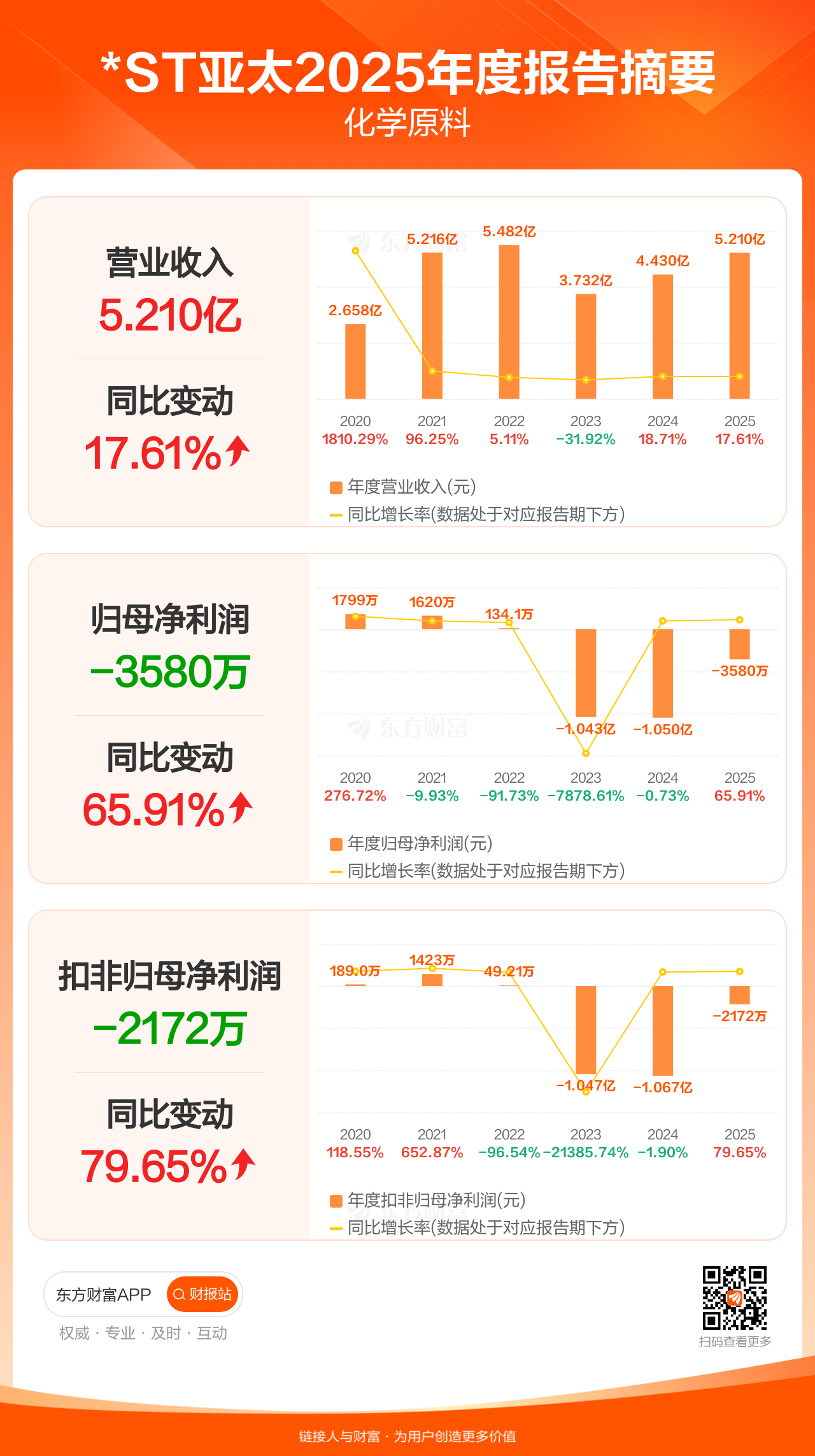 *ST亚太3月31日发布2025年年报显示,公司全年实现营业收入5.21亿元,同比增长17.61%;归母净利润-3580.31万元;扣非归母净利润-2171.93万元。