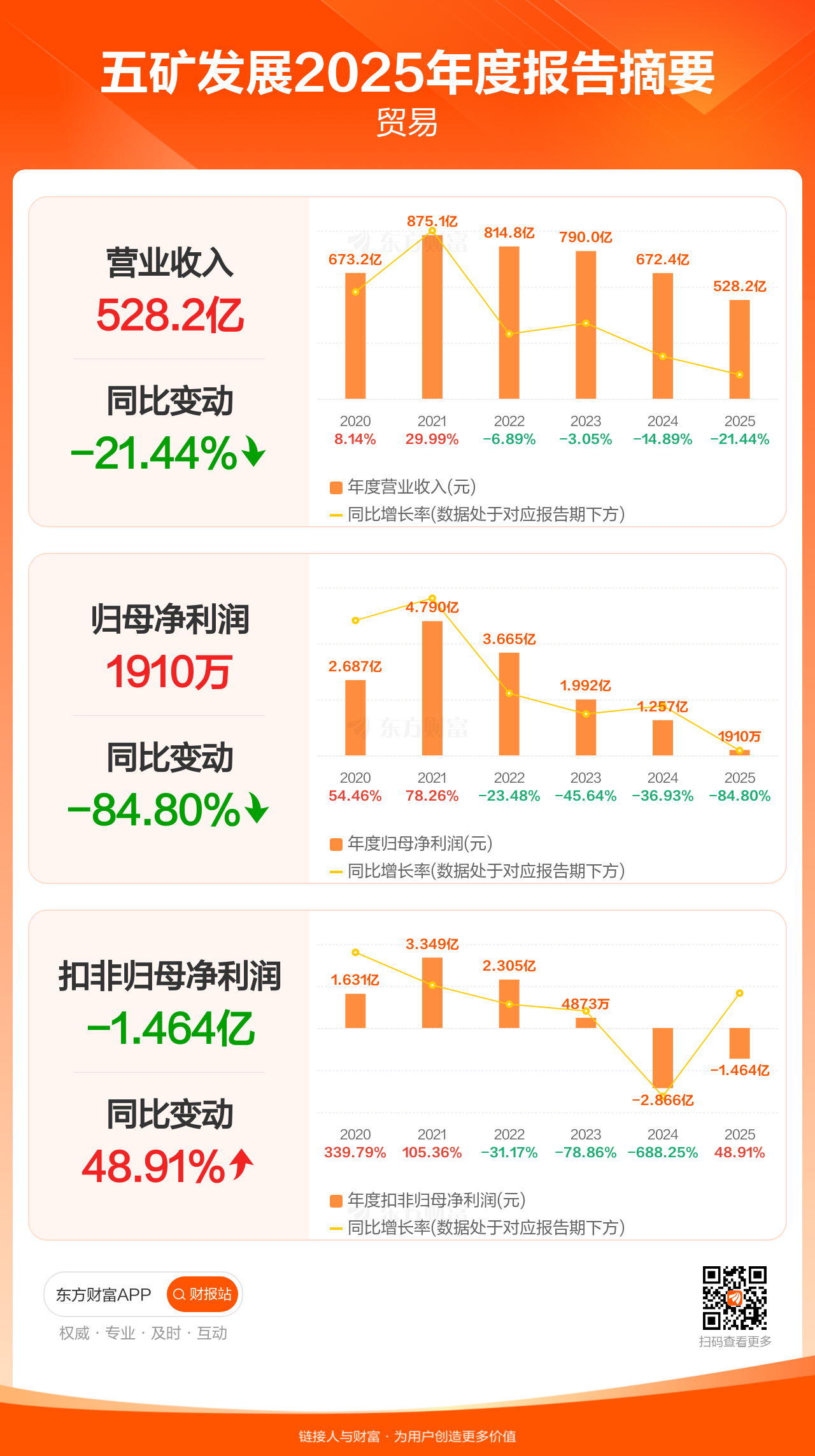 五矿发展3月31日发布2025年年报显示,公司全年实现营业收入528.23亿元,同比下滑21.44%;归母净利润1910.38万元,同比下滑84.80%;扣非归母净利润-1.46亿元。