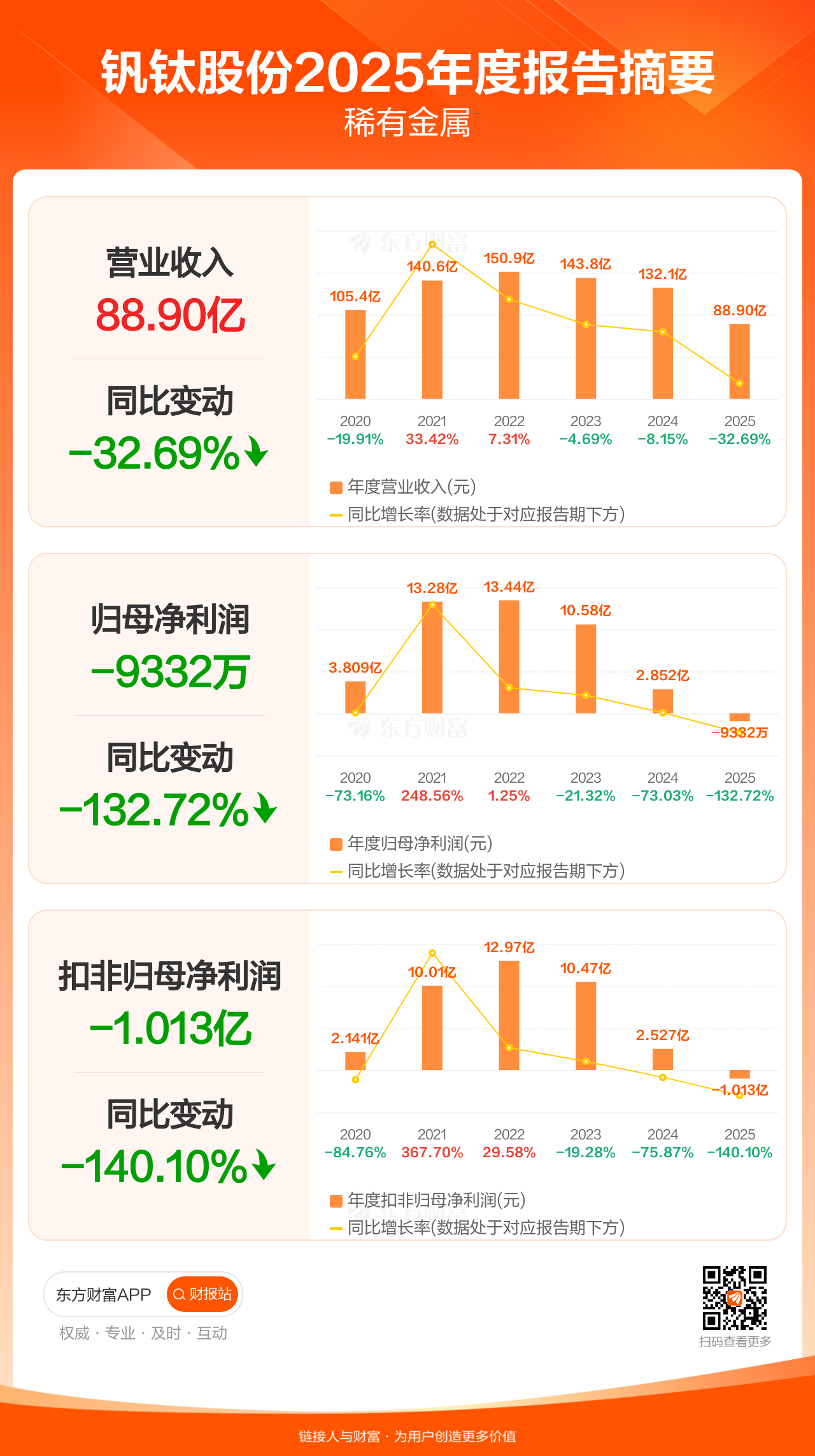 钒钛股份3月31日发布2025年年报显示,公司全年实现营业收入88.90亿元,同比下滑32.69%;归母净利润-9331.53万元;扣非归母净利润-1.01亿元。每股EPS-0.01元,低于机构一致预测的0.04元。