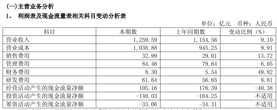 现金流方面,报告期内,公司经营活动产生的现金流量净额为105.16亿元,同比下降40.4%,主要系公司购买商品、接受劳务支付的现金较上年同期增加。
