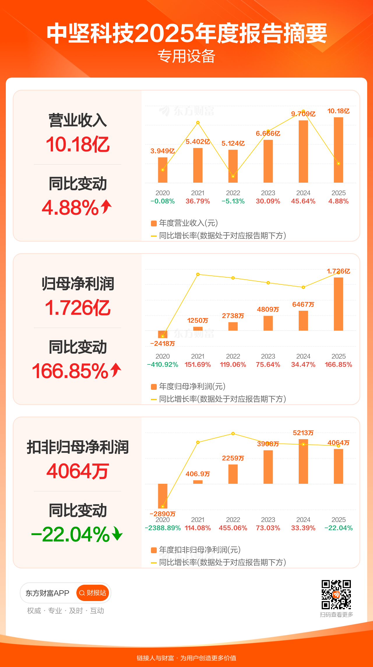 中坚科技3月31日发布2025年年报显示,公司全年实现营业收入10.18亿元,同比增长4.88%;归母净利润1.73亿元,同比增长166.85%;扣非归母净利润4063.85万元,同比下滑22.04%。