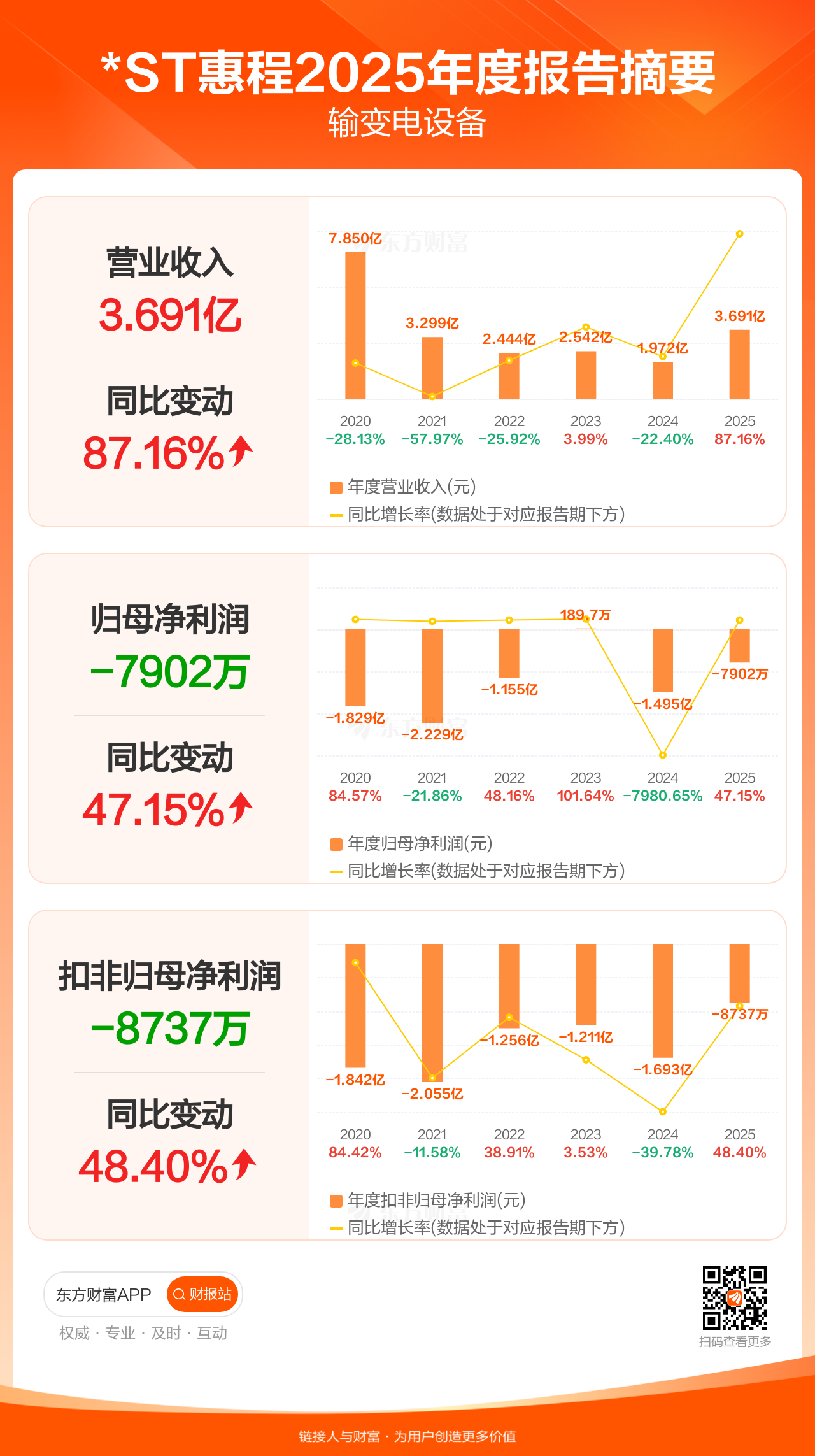 *ST惠程3月31日发布2025年年报显示,公司全年实现营业收入3.69亿元,同比增长87.16%;归母净利润-7901.84万元;扣非归母净利润-8736.78万元。