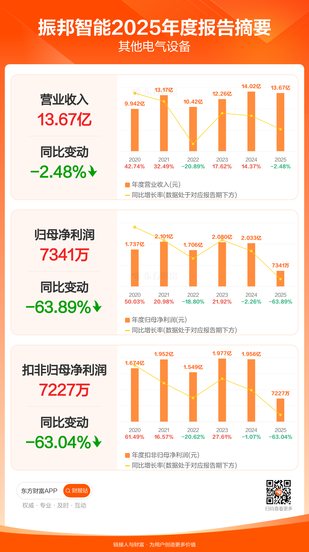 振邦智能3月31日发布2025年年报显示,公司全年实现营业收入13.67亿元,同比下滑2.48%;归母净利润7341.09万元,同比下滑63.89%;扣非归母净利润7227.27万元,同比下滑63.04%。