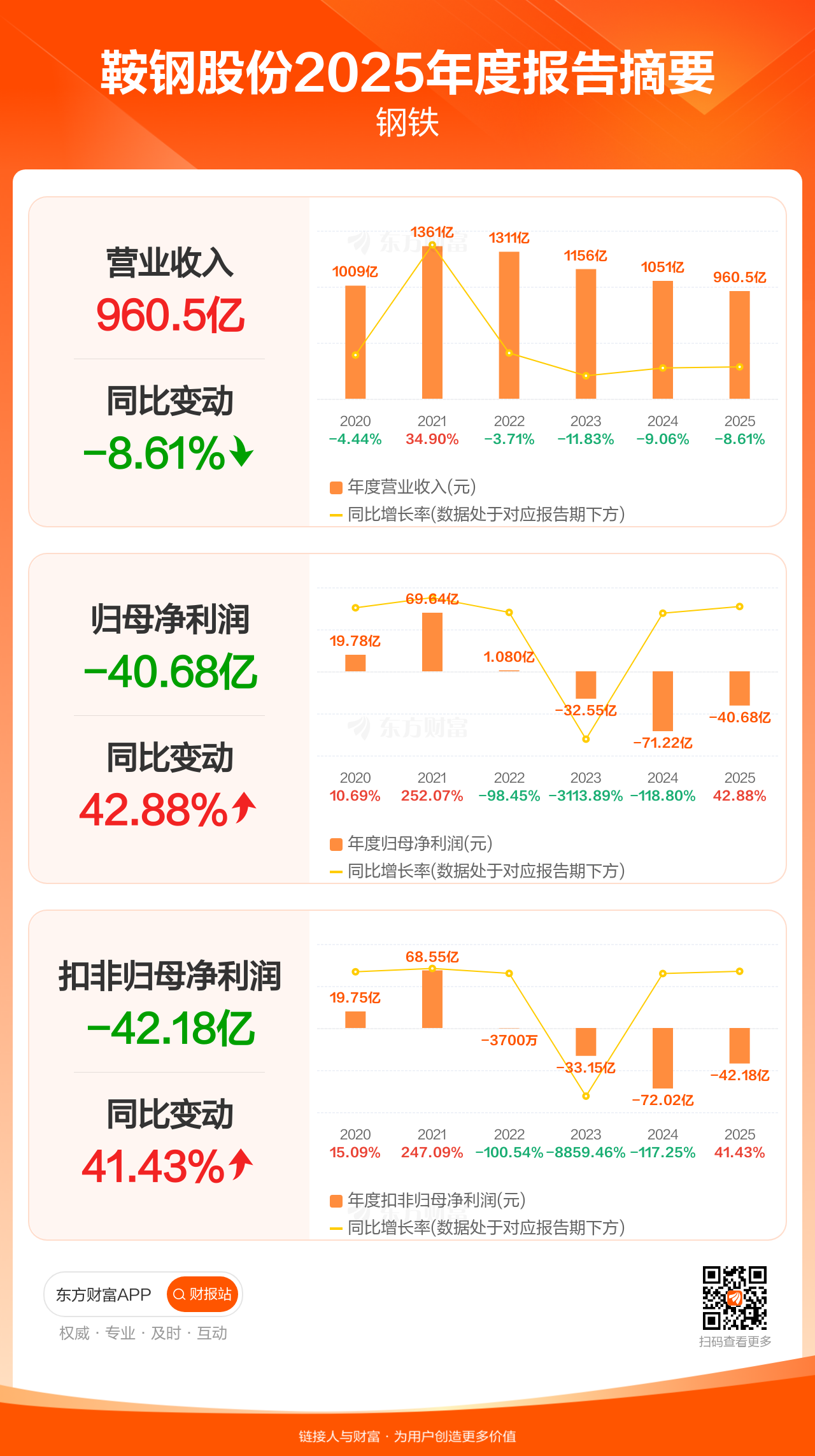 鞍钢股份3月31日发布2025年年报显示,公司全年实现营业收入960.52亿元,同比下滑8.61%;归母净利润-40.68亿元;扣非归母净利润-42.18亿元。